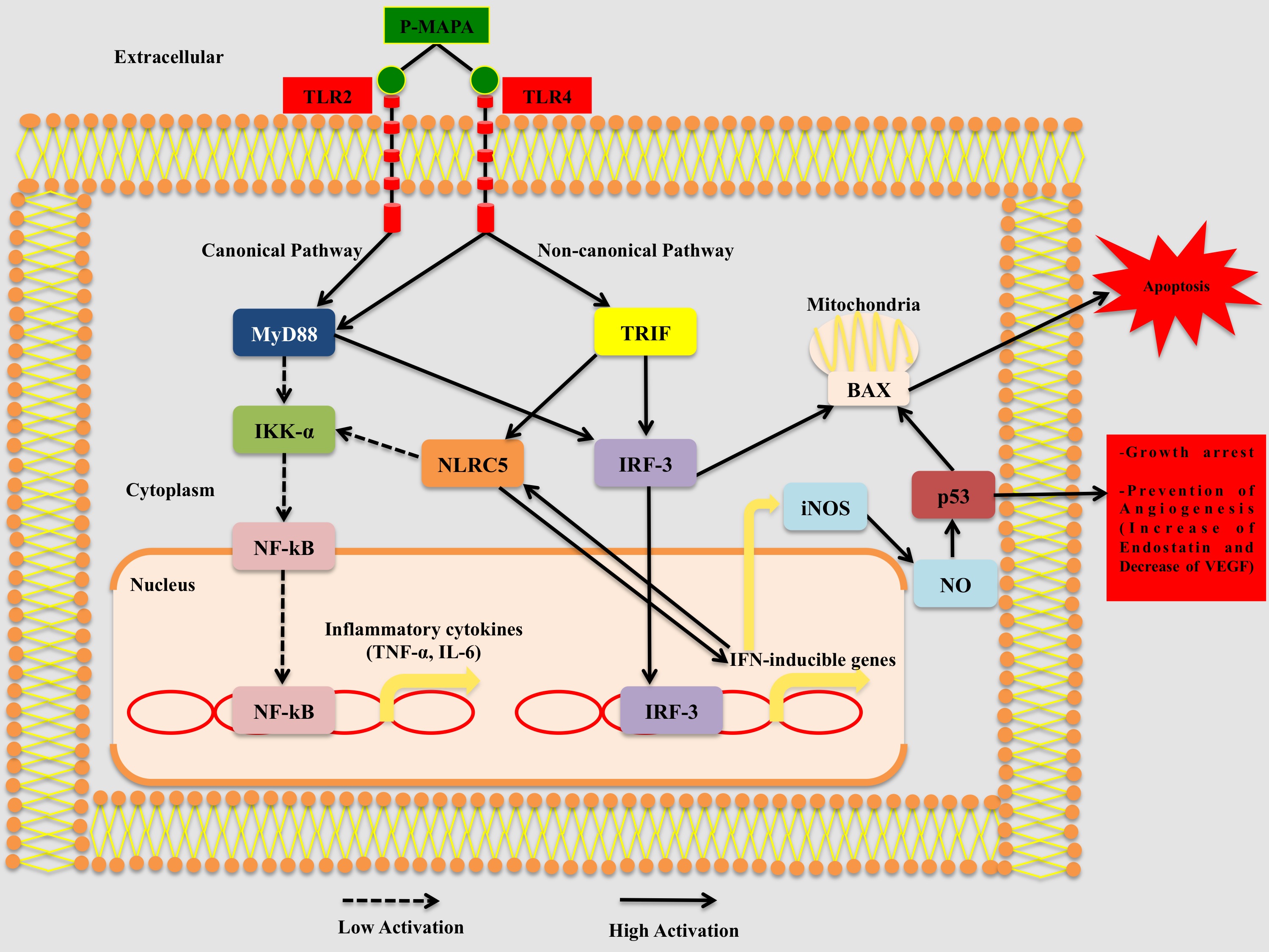 Furthermore, interferon signaling pathway induction and increased p53 protein levels by P-MAPA led to important antitumor effects, not only suppressing abnormal cell proliferation, but also by preventing continuous expansion of tumor mass through suppression of angiogenesis, which was characterized by decreased VEGF and increased endostatin protein levels.